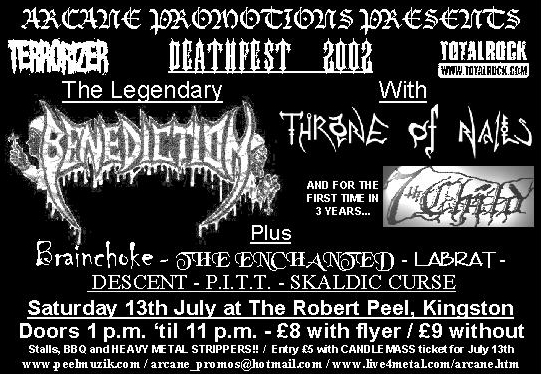 On Saturday 13th July we played at Arcane Promotions' Deathfest 2002, which took place at The Kingston Peel with: 'Benediction'; 'Throne Of Nails'; '7th Child'; 'Brainchoke'; 'The Enchanted'; 'Descent'; 'Labrat'; 'Skaldic Curse'.