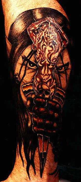 On the 21st of March 1998 a second sitting was done @ 'Skin Inc.' in Pretoria, which is a division of 'Rudy's Tattoos'. Work was done on the gloved hand, the eyes & the ears (which you don't really get to see all that well in the above pics, but they curl around the leg quite nicely).... Greywash was done on all of the above & fuck does it look good. The blade & the cross-guard have been done in a chrome finish (ie: from brown to golden brown to gold to blue) & it looks real! The eyes also had some white put in (U know, the white of the eye part) & the irises are blue. Um... what more can I say???? Oh look for yourselves.